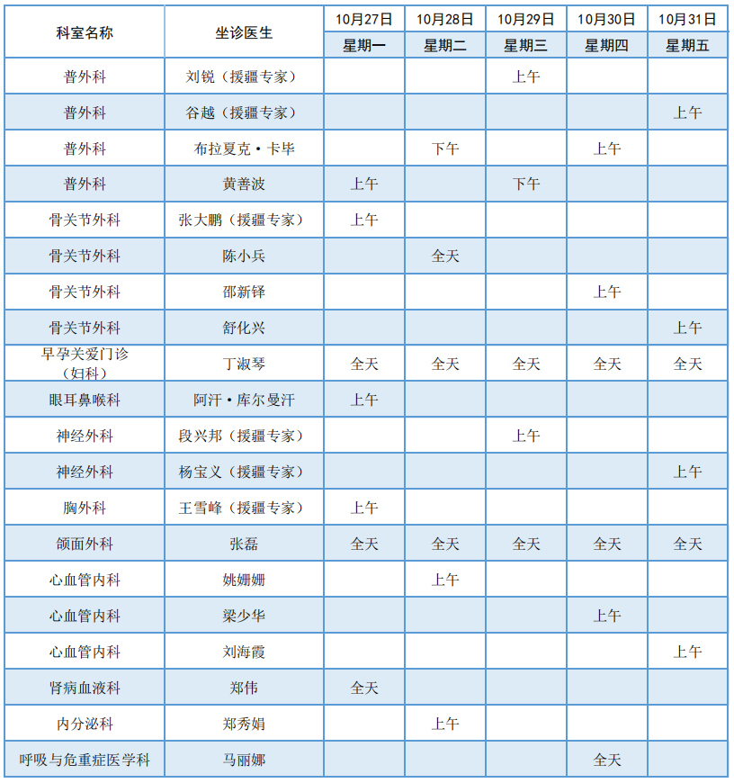 阿勒泰地区人民医院10月27日至31日专家门诊坐诊表
