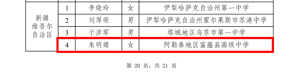 富蕴县高级中学朱明婧老师入选首批全国县域普通高中头雁教师