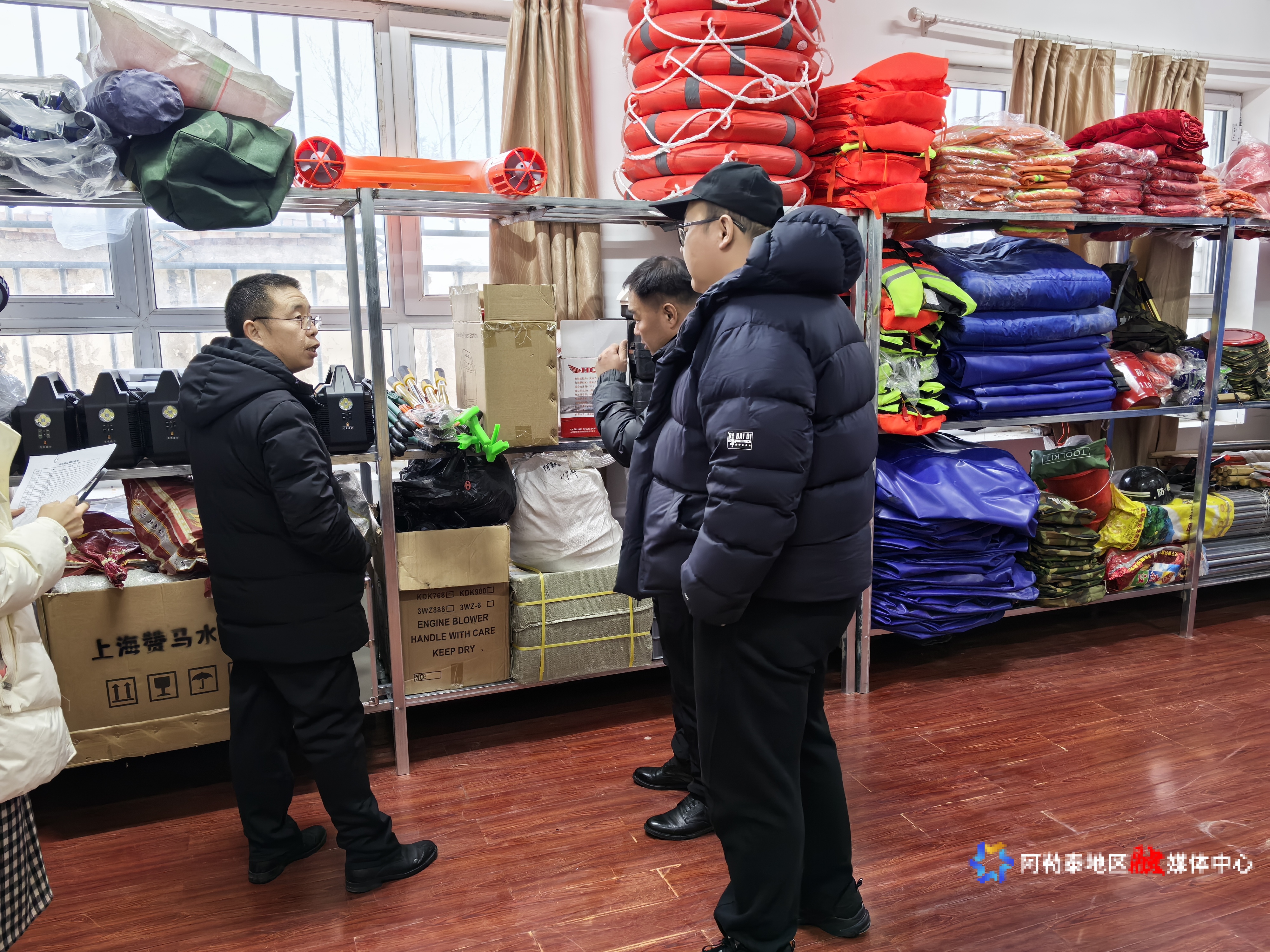 地区应急管理局工作人员对禾木物资储备点进行检查。图片由地区应急管理局提供