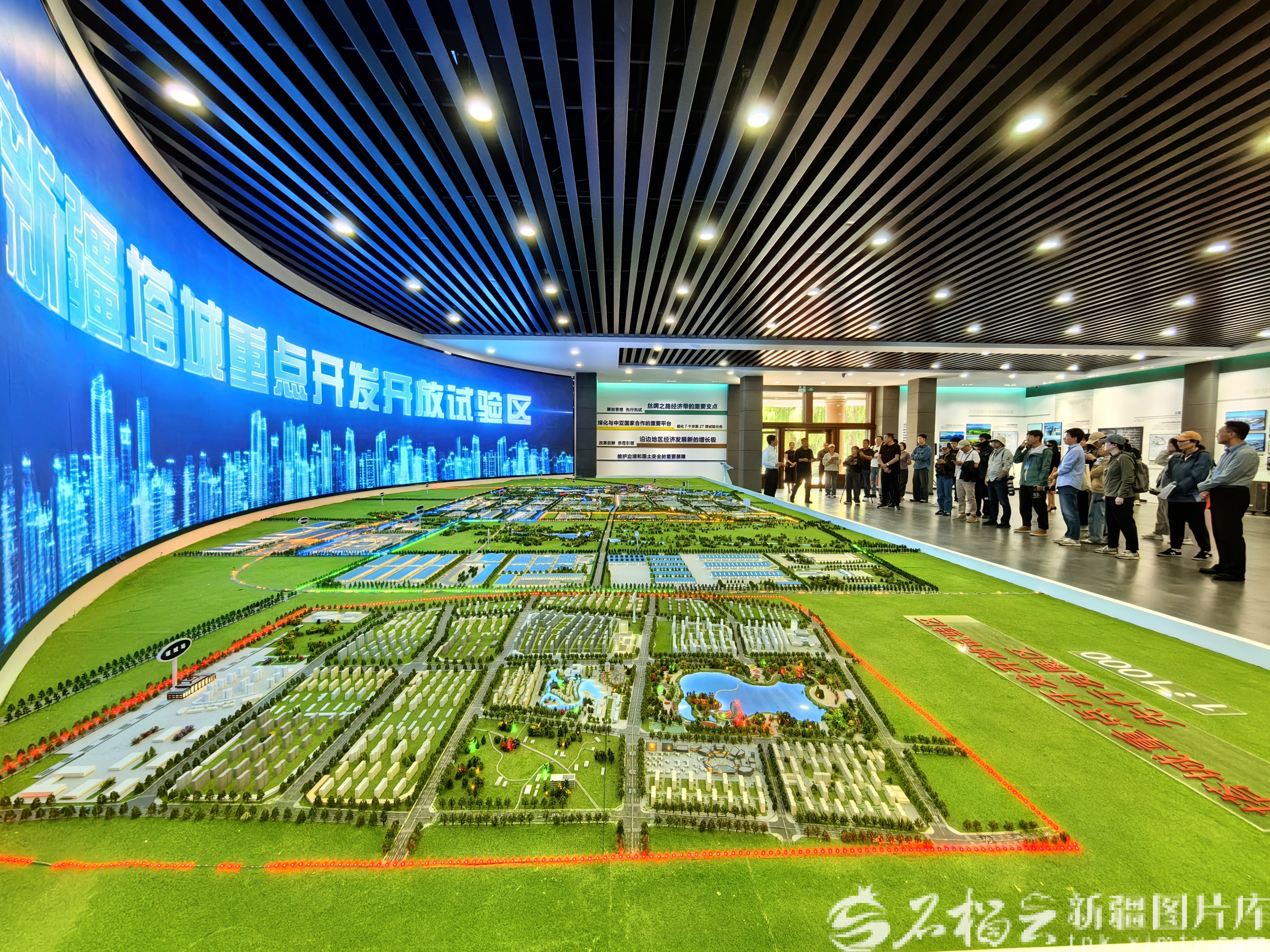 9月12日,采访团在巴克图口岸文化展示馆内,通过宣传片和沙盘了解塔城重点开发开放试验区先行发展区情况。