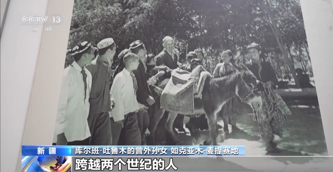 库尔班·吐鲁木的曾外孙女 如克亚木·麦提赛地:于田到乌鲁木齐2个小时,然后乌鲁木齐到北京是4个小时。很激动,跨越两个世纪的人,我们的心情一样的。那时候曾外祖父装了两大葫芦水,100多个馕。他就说只要我的毛驴不倒下去,一直走,太阳升起的东方,就能到达北京。