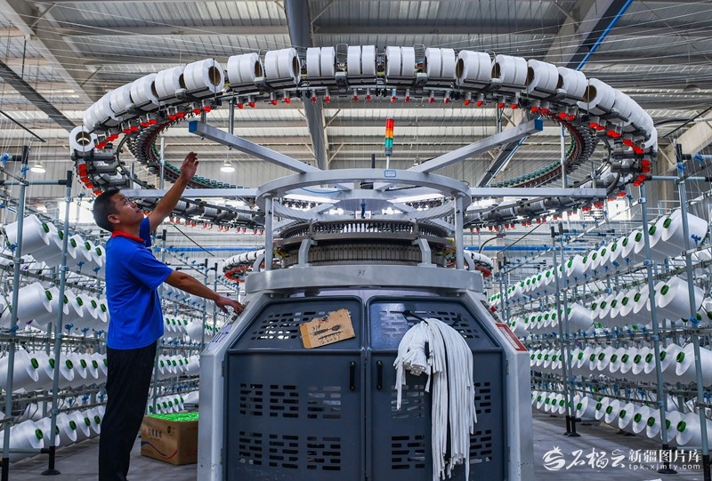 8月21日,工人在位于阿拉尔市的国家级阿拉尔经济技术开发区纱锭车间查看智能数控机。当地依托富集的棉花资源,推动纺织产业高质量发展。韩峻摄