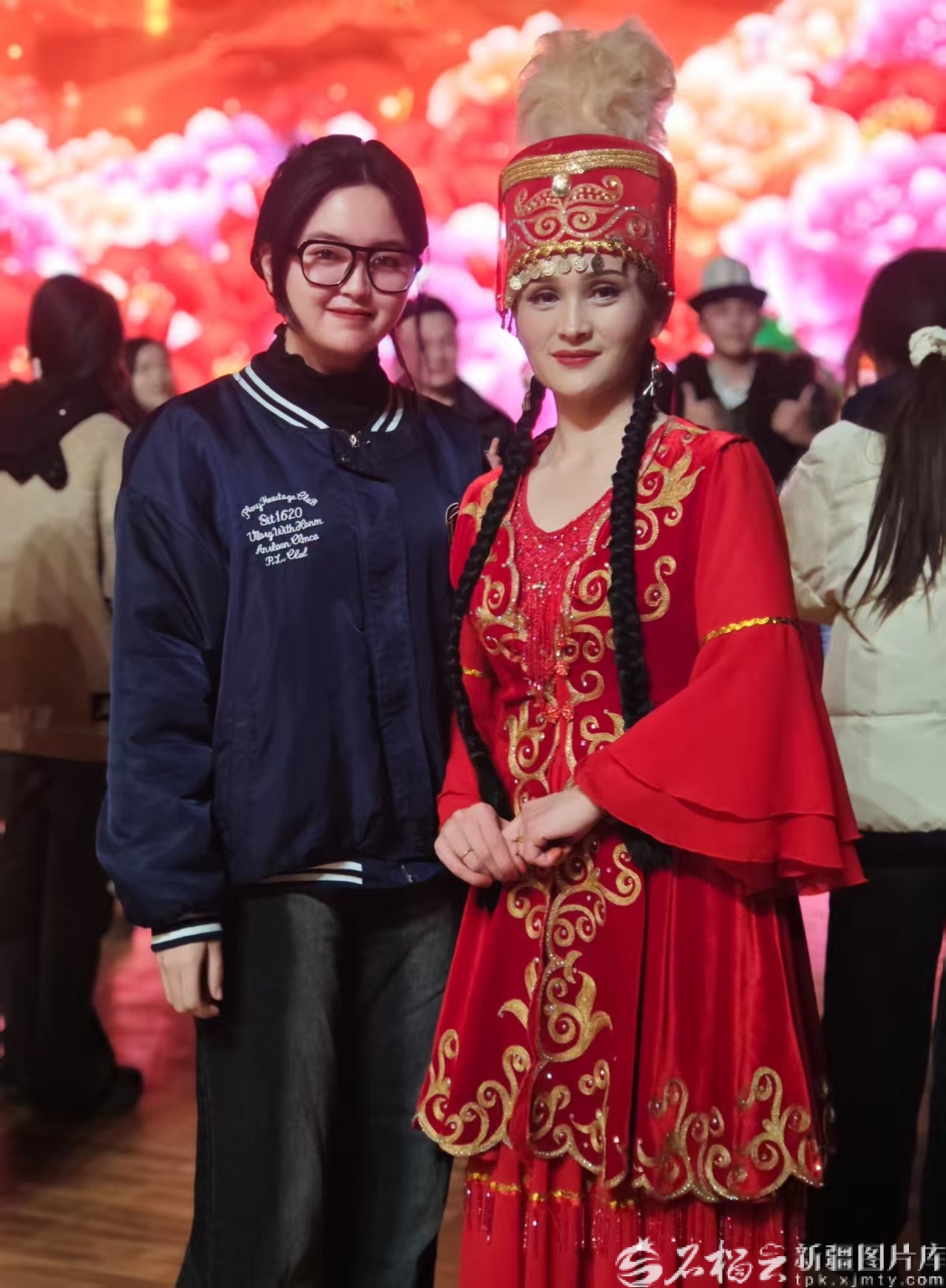 2024年12月30日,在学校举行的迎新年晚会上,茹克亚木·买买提艾沙(左)与歌舞团的演员一起合影留念。图片由受访者提供