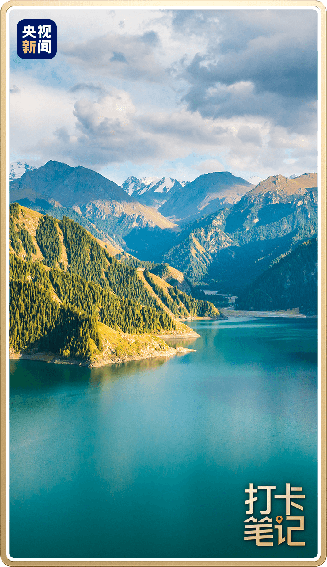 昌吉回族州阜康市境内的天山天池波光粼粼,是博格达雪山的冰川湖泊。远处雪峰倒映在池水中,湖光山色浑然一体。