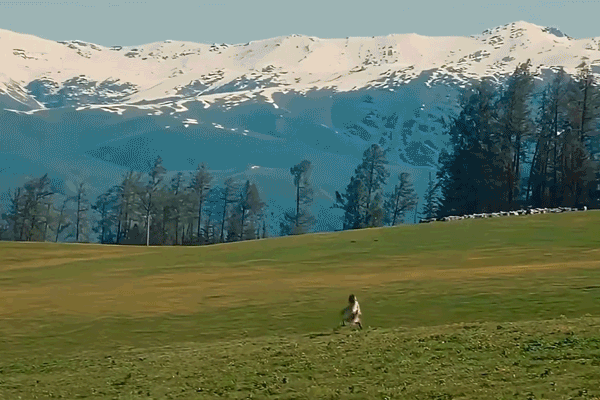 秋天,当霞光照亮天边的云彩和雪山,动物们像丝绒上散落的珍珠,整个画面悠远而宁静。