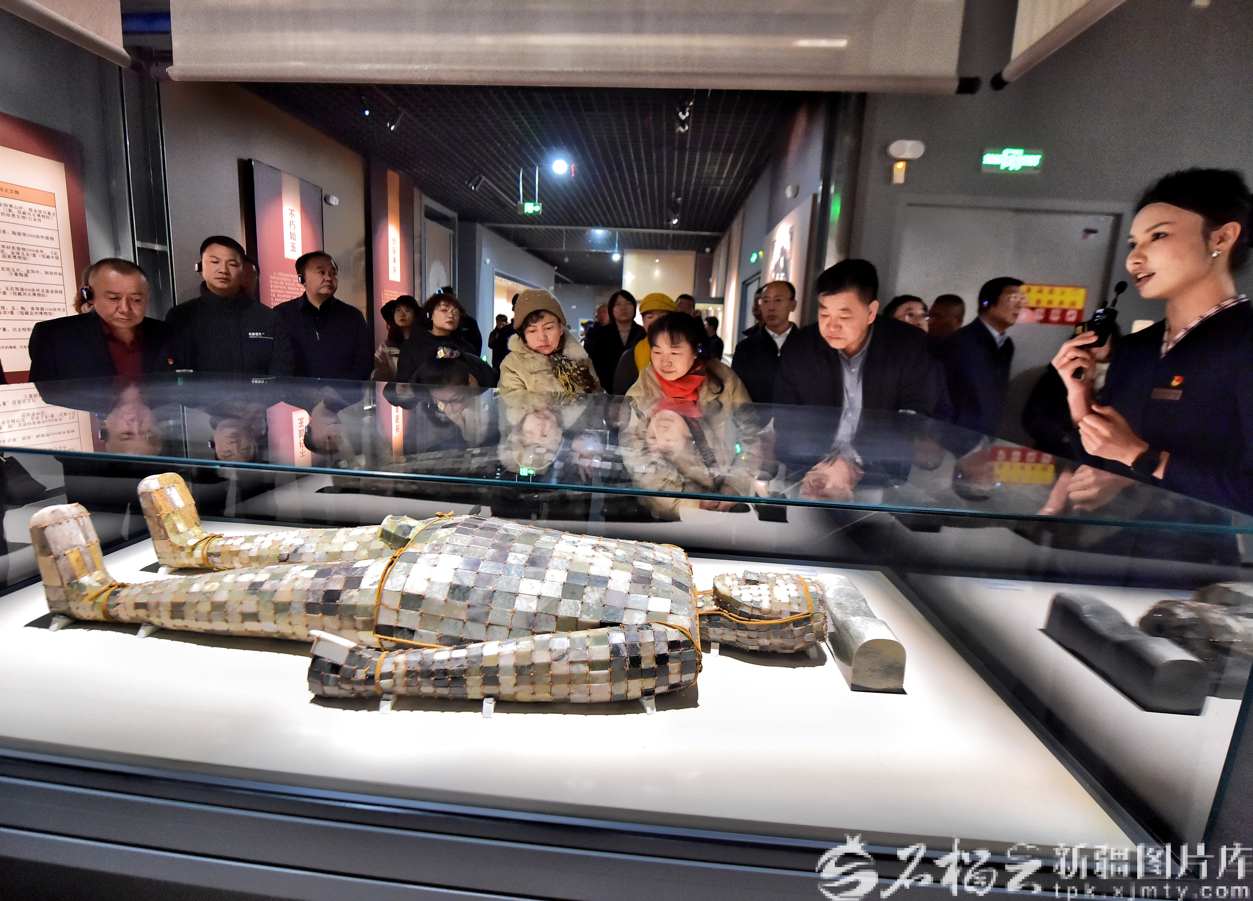 12月5日,“大汉雄风——汉代王室精品文物展”在巴音郭楞蒙古自治州博物馆正式开展。图为游客在观赏《刘焉鎏金铜缕玉衣》。