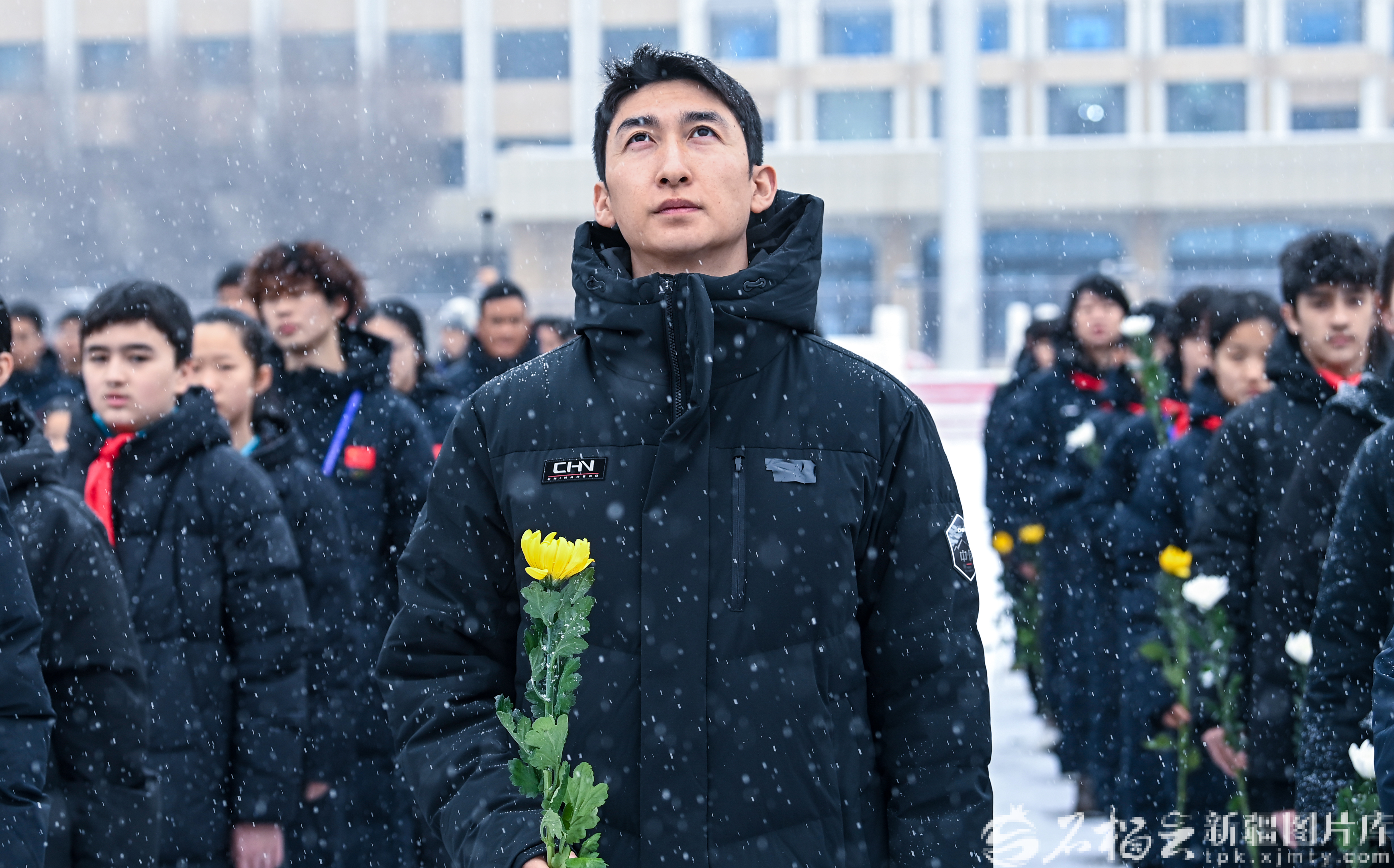 1月29日,参加2026年“奔跑吧·少年”全国青少年冬季阳光体育大会爱国主义教育活动的奥运冠军武大靖与青少年代表列队肃立,向为新疆解放与建设事业牺牲的英烈们行注目礼。