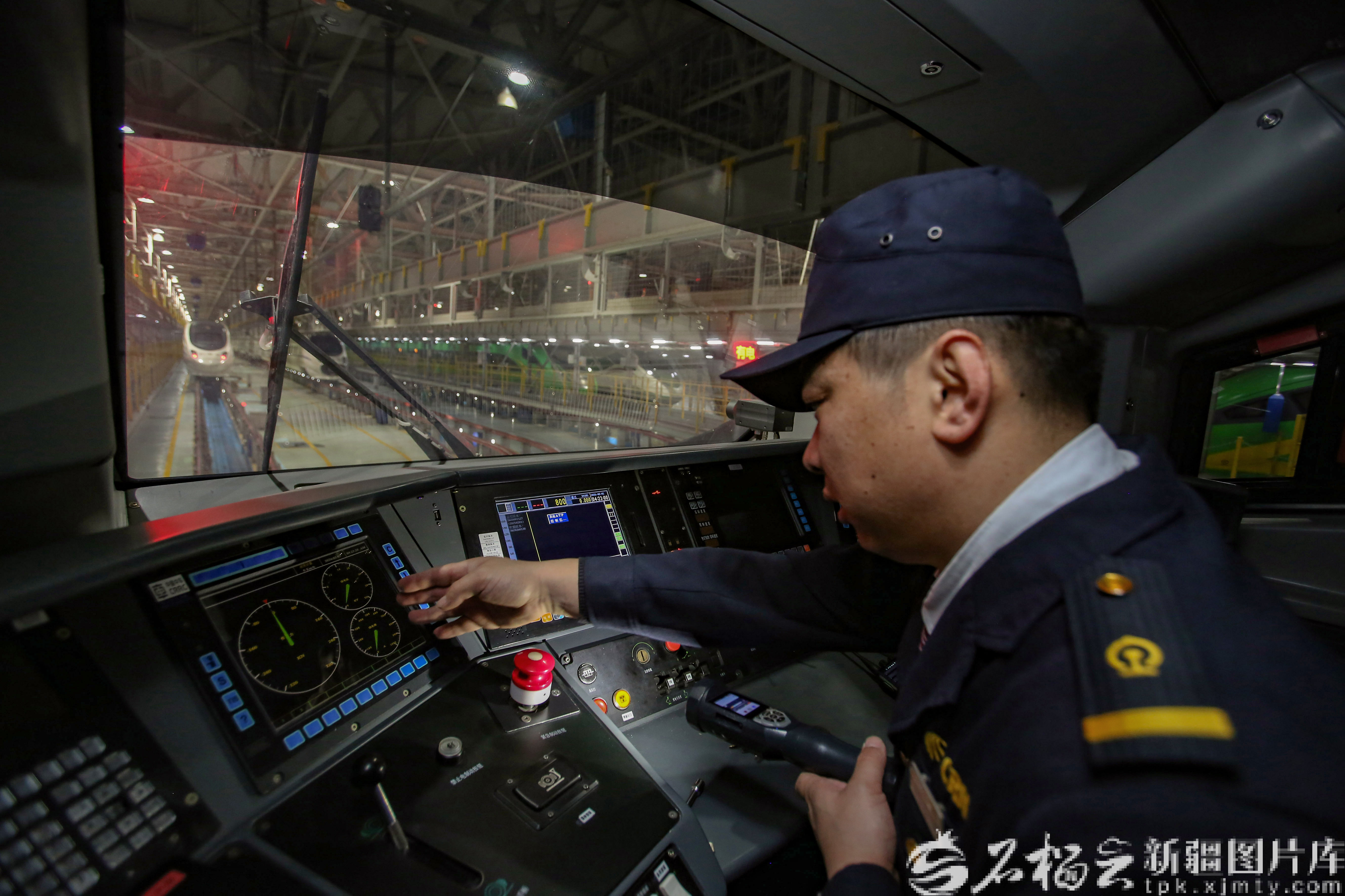石榴云/新疆日报讯(记者 蔡增乐摄影报道)凌晨3时30分,寒风凛冽,乌鲁木齐车辆段动车检修库内灯火通明,宛如白昼。随车机械师孙春宇已整装上岗,精神饱满地投入到DJ7002次动车组出乘前的最后检查中。“动检车两小时后发车,必须提前把车辆检查到位,确保万无一失。”有着十余年经验的他沉稳说道。